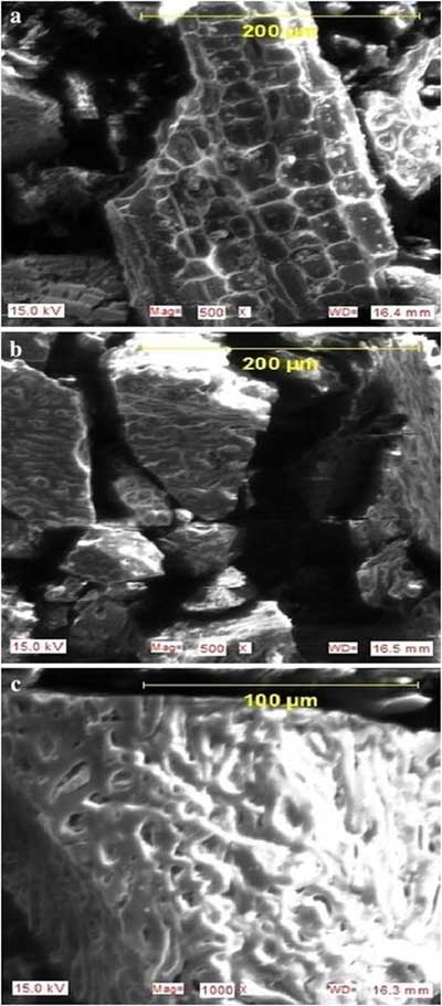 掃描電子顯微鏡通過用聚焦的電子束掃描來產生樣品的圖像。甲酸和乙酸吸附前后制備的活性炭的SEM圖如圖2所示 。 圖2a顯示吸附前活性炭的形態。碳表明活性炭的表面性質是高度多孔的,并且會增強甲酸和乙酸的吸附。碳呈現不規則的網狀結構,這意味著由粗糙表面積組成的完整的三維多孔內部結構的形成。熱解過程中焦炭的孔隙發育也很重要,因為這將通過促進活化劑(HNO 3)分子擴散到孔中從而增加活性炭的表面積和孔體積,從而增加HNO 3碳相互作用,在活性炭表面產生更多的孔。活性炭表面上這些孔的發育可能是導致水溶液中乙酸和加速那吸收量高的主要因素。很明顯在圖2 B,C的吸附前活性炭的表面上的大的孔碳的表面上吸附的吸附后均減少。這意味著甲酸和乙酸被吸附到制備的活性炭的表面上。