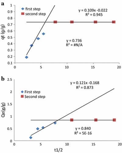 吸附機理粒子內擴散模型用于確定總體吸附速率是否通過顆粒內擴散來控制,即吸附物質分子進入活性炭孔隙內部。q t對t 1/2的曲線圖給出如圖3所示的線性關系 。截面(C)的值和斜率的粒子內擴散速率常數(Kid)的計算值總結在表中。較大的截距值表明,與表面擴散相比,顆粒內擴散具有較小的作用。該圖顯示在吸附過程中發生兩個步驟。急劇上升的部分是外表面吸附階段,而第二直線部分是逐漸吸附階段,其中顆粒內或孔擴散是速率限制。急劇上升部分的高R 2值表明外表面吸附是速率限制步驟。線偏離原點和低R 2逐漸吸附階段的值表明,顆粒內擴散不是唯一的限速步驟,因為早期報道了類似的結果。這意味著外表面的吸附或瞬時吸附階段發生,并且可以被用來描述吸附過程的機構。
