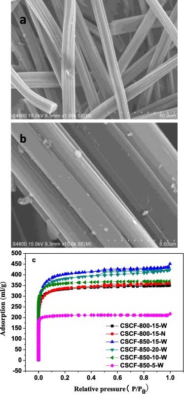 SEM和氮吸附/脫附等溫線進(jìn)行選擇活性炭來說明表面形態(tài)和孔結(jié)構(gòu)。如圖所示圖一,棉桿制成的活性炭形態(tài)是光滑的,并且微晶是清楚的。在不同活化溫度制備四個(gè)選定的樣品的氮吸附等溫線和停留時(shí)間。它可以從中可以看出該四個(gè)選擇的樣本的所有的等溫線顯示了在低的相對(duì)壓力的急劇增加(P / P 0< 0.05),說明在碳骨架大量微孔的產(chǎn)生。活性炭的等溫線的下面部分幾乎是線性的,吸附和解吸的分支基本上是一致的。