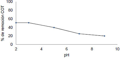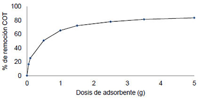 對于具有官能團相關聯的吸附現象增加對應于所述頻帶3200-3600cm-1之間的信號的存在證明(拉伸振動相關聯OH醇和羧酸),2700-3000cm-1(帶有羧酸和羰基化合物基團相關聯)和在范圍1000至1200cm-1(相關羰酸基團)。注意2250-3300cm-1之間相關聯的帶的外觀與該鏈接N + -H(離子),用于氨的吸附。在圖3中 顯示了pH對污染物中TOC吸附的影響。在酸性介質(約50%)中獲得最大的去除率。高于pH 3.0觀察到在流出物中去除該污染負荷的降低。在圖4示出了活性炭劑量對TOC去除存在于污染物的效果。活性炭的提高劑量增加而增加的污染物去除的水平,但是,在較高濃度情況下不會增加去除水平,因為活性炭的吸附水平在一定數值中達到了平衡。從所得結果中,選擇2.5g的活性炭劑量。從這個數值來看,總有機炭TOC去除率約為80%。