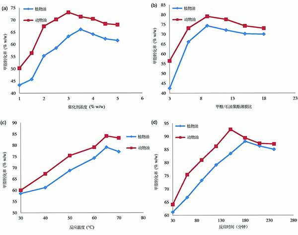 測試的非食用油的低酸值使得能夠通過活性炭氫氧化鉀催化的酯交換反應直接形成甲酯。因此,優化了工藝參數,例如固體堿催化劑的量,甲醇與油的摩爾比,溫度和酯交換過程的持續時間。使用催化劑與油的酯交換通過測試不同量的催化劑進行研究,催化劑的范圍為1.0-5.0%wt%,其中增量為0.50%,如圖3(a)所示。甲醇與油的摩爾比,溫度,時間和反應的攪拌速率分別為6:1,60℃,120分鐘和600rpm。觀察到甲酯產率隨著催化劑量的增加而逐漸增加,這是因為催化劑的量越多,活性中心的數量越多,這反過來導致更高的轉化率。然而,與動物油脂相比,植物油通過所述固體催化劑的酯交換需要(3.5%w/w)催化劑以產生甲酯的最大產率,其中動物油脂在催化劑的(3.0%w/w)下表現出最高的甲酯產率。實現各種原料的最大轉化率所需的催化劑的最佳量的差異可歸因于原油的酸值以及油的類型。植物有是一種初榨油,與經過油炸過程的動物油相比,沒有經過任何熱處理,油炸過程會顯著影響油的化學成分。然而,由于高粘度混合物,固體催化劑的量超過最佳量導致較高的傳質阻力,導致甲酯產率較低。