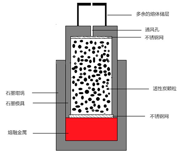 活性炭是性價(jià)比高的碳質(zhì)材料,具有低堆積密度,高比表面積和優(yōu)異的化學(xué)穩(wěn)定性。它廣泛用于水處理,以吸收飲用水中的雜質(zhì)。AZ91鎂合金(9重量%Al,1重量%Zn,0.5重量%Mn,余量Mg)用作金屬?gòu)?fù)合泡沫的基質(zhì)?;钚蕴繌?fù)合泡沫材料的制造,首先將石墨模具填充在四個(gè)單獨(dú)的填料和振動(dòng)步驟中,在每個(gè)步驟中使用等量的活性炭顆粒。這種壓實(shí)方法使整個(gè)樣品高度的密度梯度最小化。在該步驟之后,將不銹鋼網(wǎng)插入模具的開(kāi)口端以將活性炭顆粒保持在適當(dāng)位置。組裝在充滿氬氣的手套箱內(nèi)進(jìn)行,以最小化系統(tǒng)中的氧氣水平。為此,將AZ91合金塊插入石墨坩堝內(nèi),并將填充的石墨模具倒置在坩堝內(nèi)。然后將鋼帽放在模具頂部以在滲透鑄造期間收集過(guò)量的熔體。在下一步中,這些部件位于不銹鋼套管內(nèi)。最后,將組件放入電爐內(nèi)并在660℃的溫度下保持45分鐘,同時(shí)使用保護(hù)性氬氣氛以防止鎂合金在鑄造過(guò)程中氧化燃燒。通過(guò)施加0.02MPa的壓力迫使金屬熔體滲入填充的活性炭顆粒床。在大氣條件下冷卻模具后,手動(dòng)從模具中取出生產(chǎn)的樣品。圖1顯示了使用的設(shè)置的示意圖。
